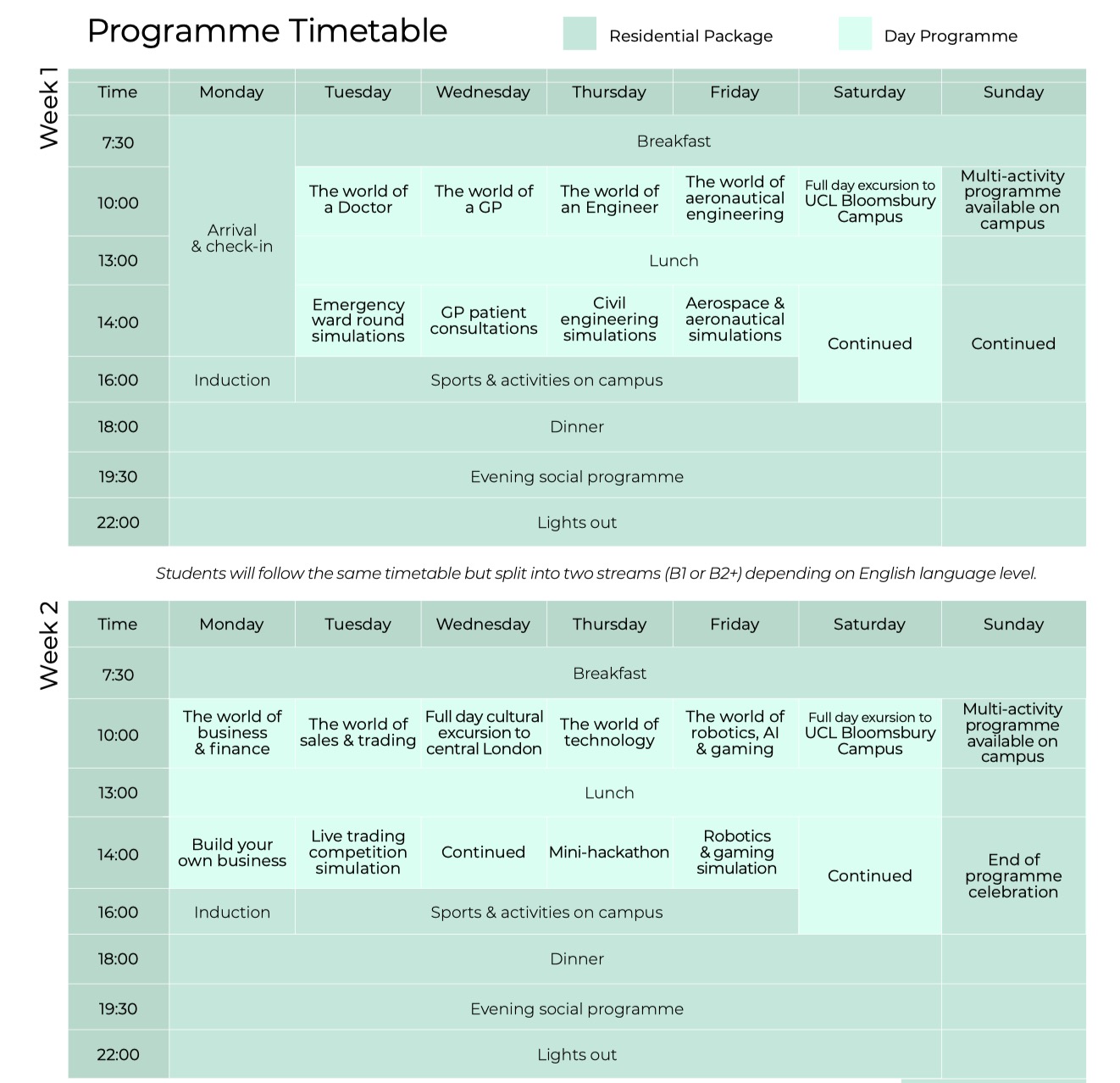 - Ogni settimana un'escursione di un'intera giornata al campus Bloomsbury dell'UCL, per esplorare la vita universitaria. È prevista inoltre un'escursione di un'intera giornata a Londra per visitare i luoghi simbolo della città.